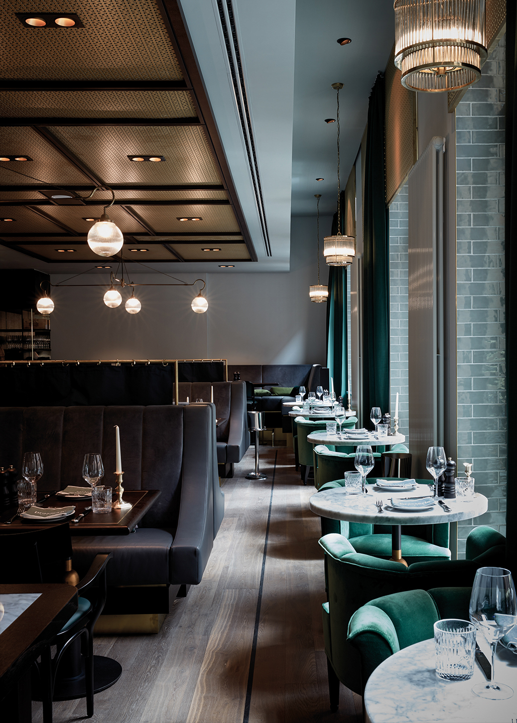 As a tribute to French cuisine Tortue’s warm colours and a chic ambience define the culinary experience in one of the hotels two restaurants. Guests are transported to a different world within seconds of arrival. Elegant, seductive and yet cosy . Dark moss green leather booths combined with wood panelled walls and velvety materials provide a serene and elegant atmosphere. Natural stone and brass elements complement the black, white and green mosaic flooring. Guests can experience how absolute classics à la Bœuf bourguignon, lobster or ceviche are prepared in front of your eyes in the open kitchen.