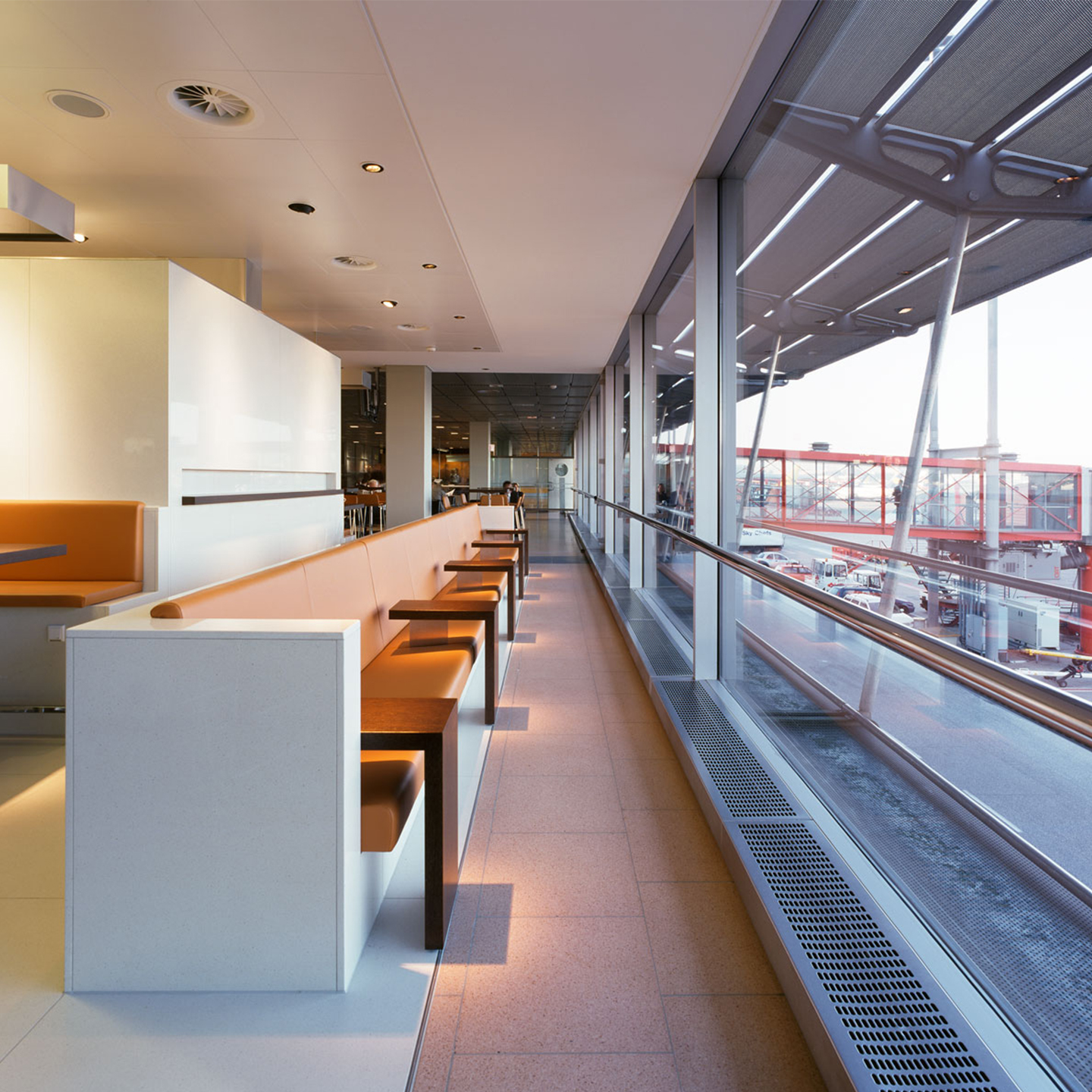 White stone and dark wooden elements open the bar to the visitor as a spatial sculpture. Different types of seating offer every opportunity to enjoy a drink or a coffee and snack. The panoramic view is over the apron where aeroplanes arrive and depart. The Pier Bar is a communicative meeting point especially for business people forming a true gateway or marketplace for the city.